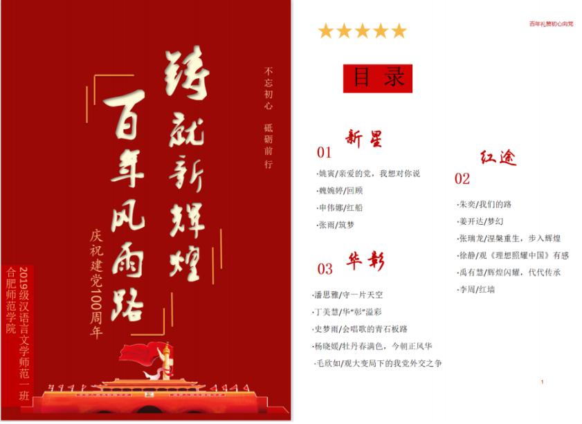 紧扣“用心学史、用情领悟、用笔记录、用力落实”的编纂初衷,公司党委高度重视,2019级汉语言文学(师范)1班、2班班刊编委会在辅导员郝嘉乐老师的指导下,经过选题、组稿、审稿、编校、封面设计、出版等一系列环节,历时两月有余,完成党史学习教育专题班刊。自征稿以来,班级同学积极响应,成刊共收录作品27篇,内容包含党史学习教育感悟、树立理想信念、自强立志成才、革命书籍影片观感等丰富内容。