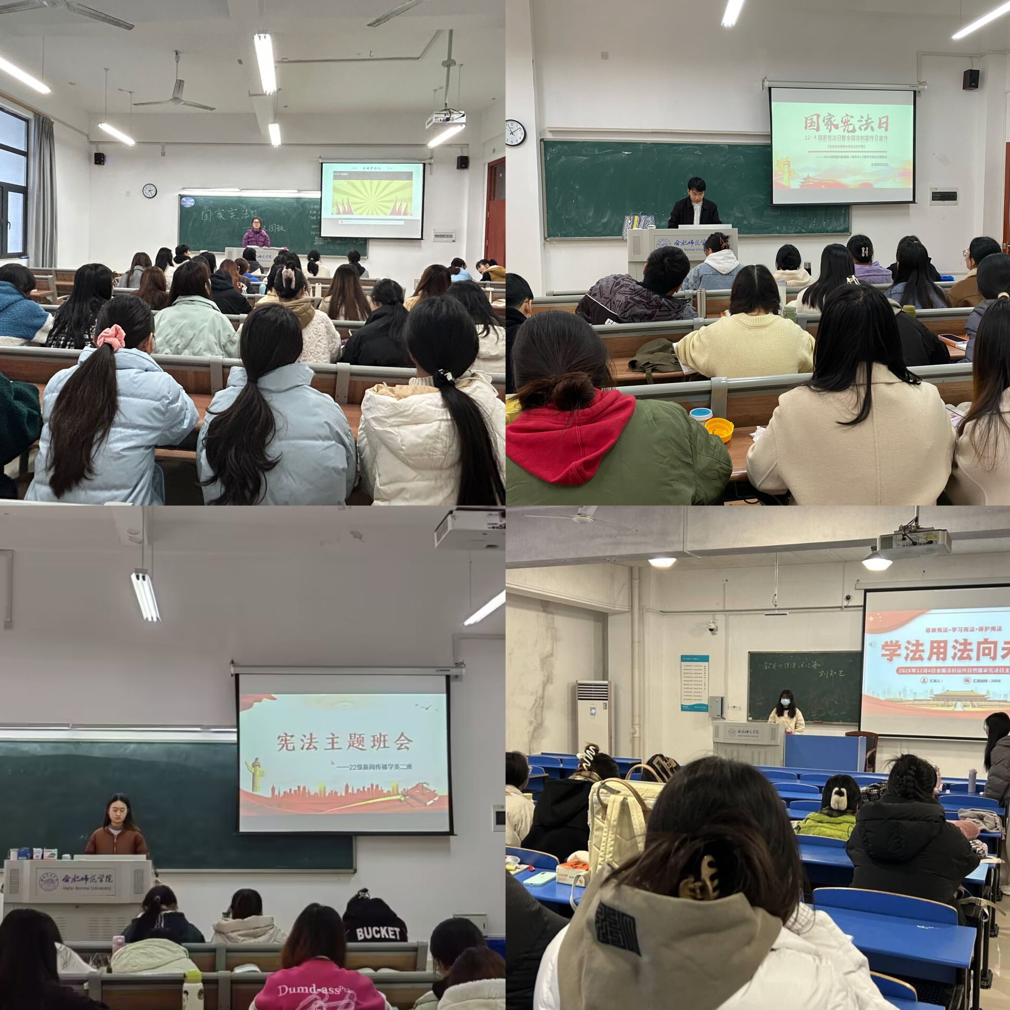 各年级辅导员和班委向同学们讲述了宪法在我国的重要地位,宪法是国家的根本大法,并通过讲解告诫大家要弘扬宪法精神,深刻认识并学习贯彻实施宪法的重大意义,自觉在宪法和法律范围内活动,引导同学们尊崇宪法、学习宪法、遵守宪法。