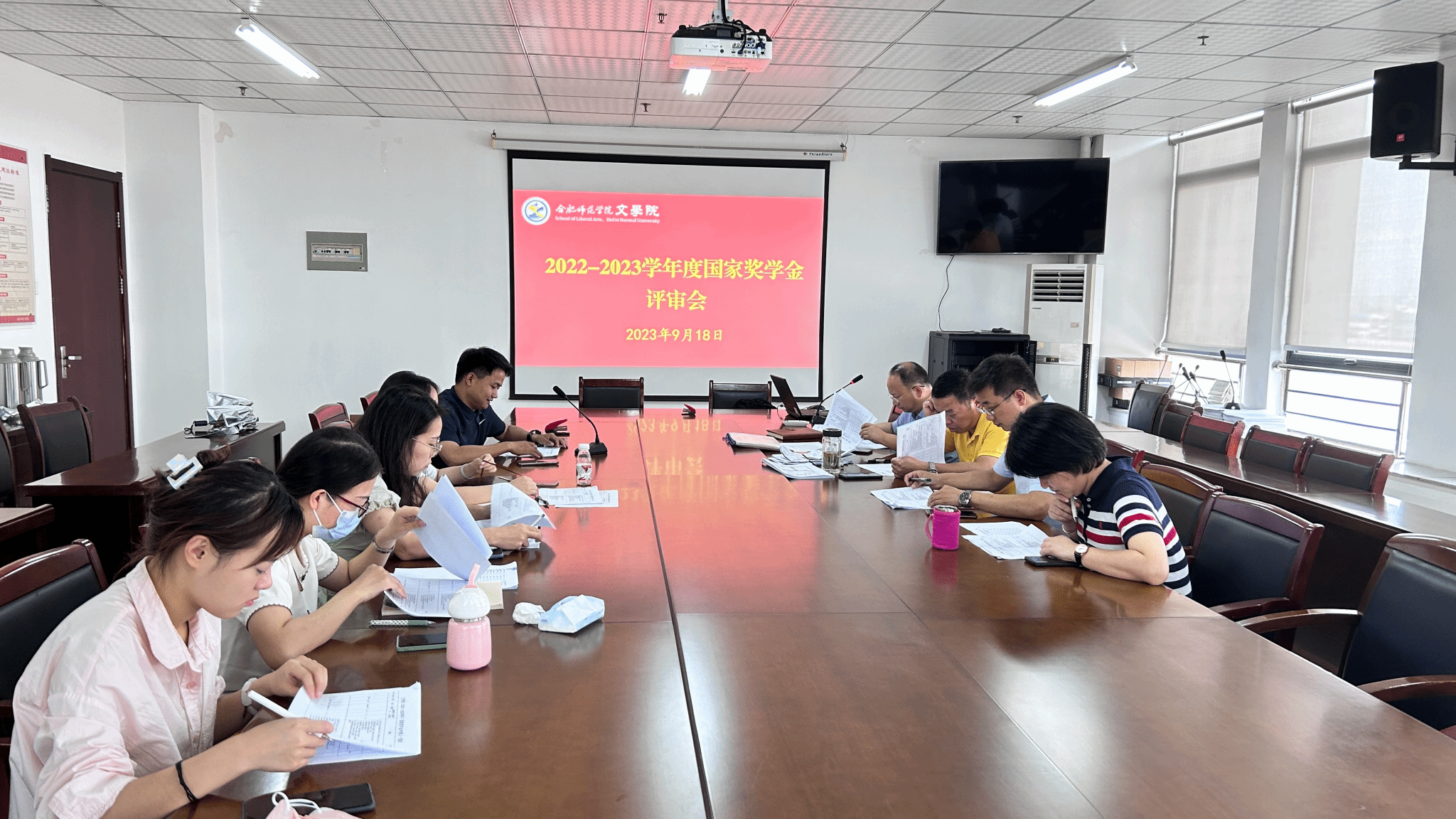9月18日下午12时30分,太阳成集团122ccvip在行知楼802会议室举行了2022-2023学年国家奖学金评审会,太阳成集团122ccvip国家奖学金评审小组全体成员和员工代表参加评审会。