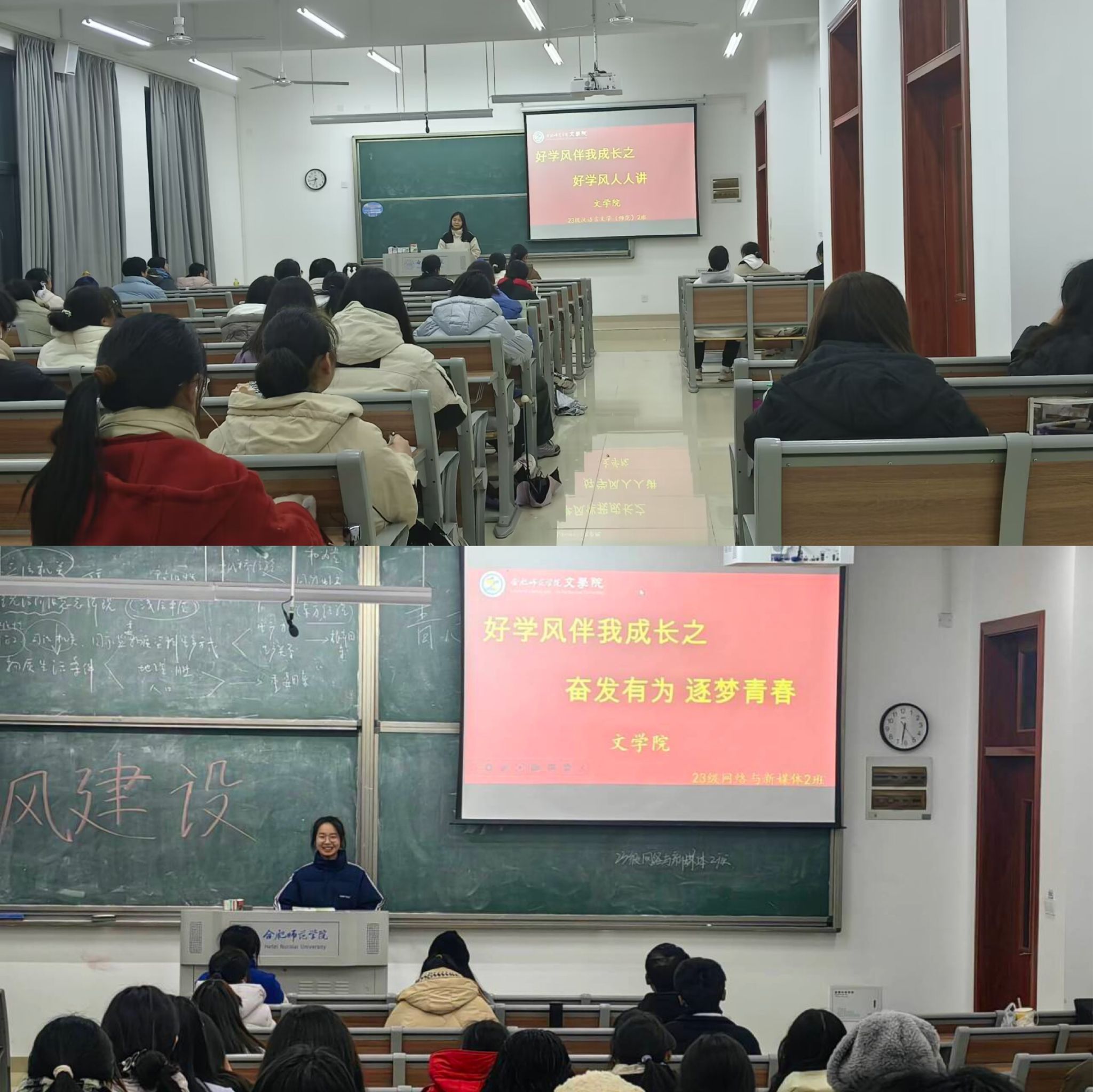 此次“好学风人人讲”活动,2023级各班级根据班级同学个性,结合专业特色,制定了具体的建设方案,利用晚自习时间,开展形式多样、丰富多彩的学风创建活动。汉语言文学(师范)1班首次开展"我来演讲,你来听"主题活动,在每位同学激情澎湃的演讲中,深刻感受到对知识的渴求,对学习的不怠。