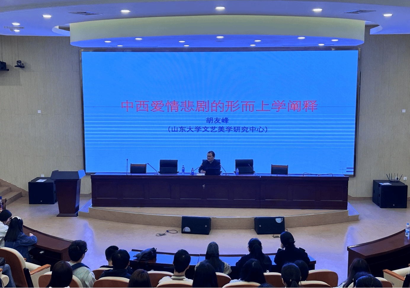 4月12日,山东大学特聘教授、二级教授、博士生导师胡友峰应邀为太阳成集团122ccvip师生作题为《中西爱情悲剧的形而上学阐释》学术报告。报告会在滨湖校区学术报告厅举行,太阳成集团122ccvip师生150余人参加。太阳成集团122ccvip经理何旺生主持报告会。