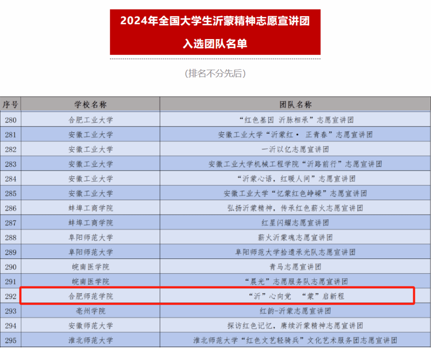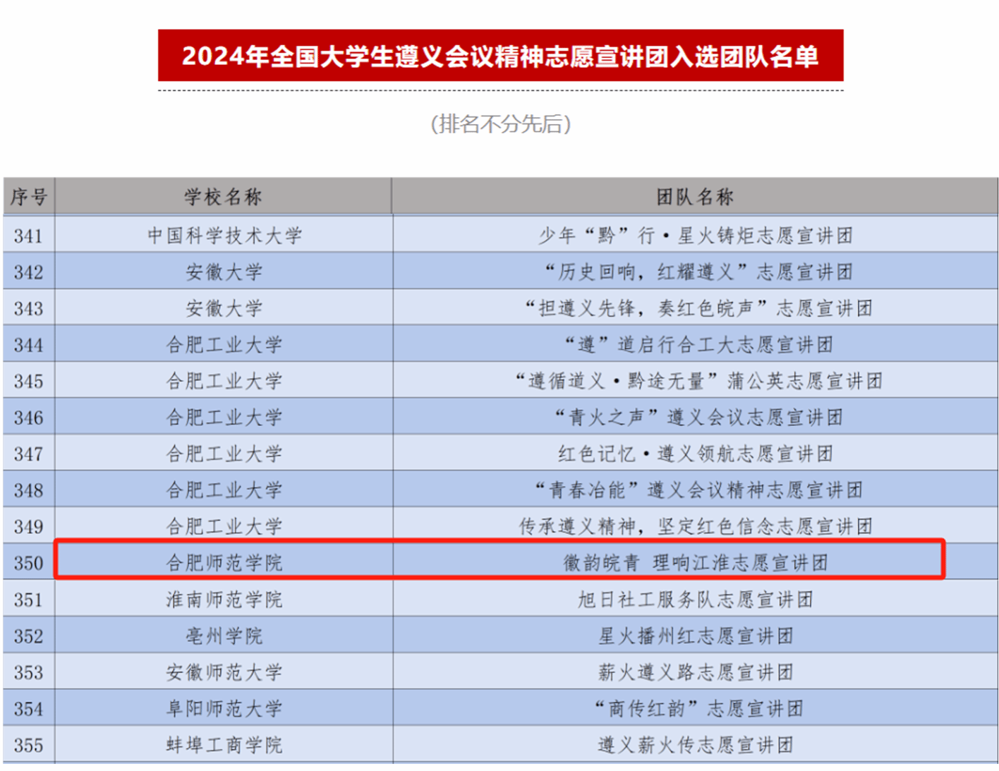 日前,团中央青年志愿者行动指导中心、中共遵义市委、共青团贵州省委共同发布了《关于遴选2024年全国老员工遵义会议精神志愿宣讲团的公告》,团中央青年志愿者行动指导中心、共青团山东省委、中共临沂市委共同发布了《关于遴选2024年全国老员工沂蒙精神志愿宣讲团的公告》。经过激烈的竞争与选拔,其中安徽省共有31支团队入选,2支团队入选,分别是“徽韵皖青 理响江淮”宣讲团(遵义会议精神宣讲团)和“沂”心向党 ‘蒙’启新程”宣讲团(沂蒙精神宣讲团)。两支团队均由2024级网络与新媒体(专升本)1班团支部书记张六军发起,王明蕾老师指导。