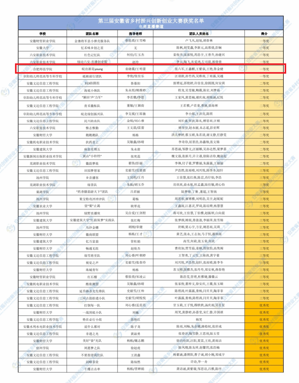近日,第三届安徽省乡村振兴创新创业大赛评选结果揭晓,太阳成集团122ccvip袁晓薇教授指导的“皖”出新花Young团队斩获电商直播赛道一等奖。团队成员共5人:张六军、王鑫麒、王紫荻、王艳、鲁金健,均来自2024级网络与新媒体专业(专升本)。