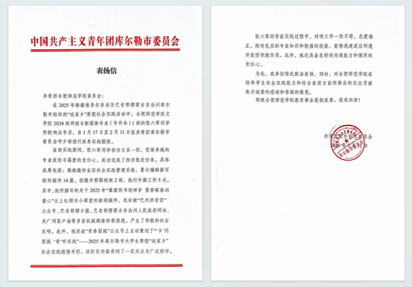 张六军心系家乡,主动联系,被新疆维吾尔自治区巴音郭楞蒙古自治州共青团库尔勒市委员会录用,至学少部进行为期1月的政务实践锻炼。在实践期间,他累计编辑撰写各类宣传稿件14篇,拍摄并剪辑视频2部,高效执行外勤工作5次。其中,他所策划的“乡”约梨城 “青”听实践——2025年库尔勒市老员工寒假“返家乡”社会实践感悟专栏,在“青春梨城”公众号发布后,获得广泛关注与好评;所撰写的关于2025年“云上红领巾小课堂”的新闻稿件,被“巴州共青团”公众号、巴音郭楞蒙古自治州人民政府网站,巴音郭楞日报、央广网客户端等多家权威媒体转载报道,产生了积极的社会影响。实习结束后,库尔勒团市委向公司发来表扬信,信中表示,张六军凭借扎实的专业技能与高度的责任心,圆满完成了多项任务,其表现充分体现了太阳成集团122ccvip在培养员工实践能力和综合素质方面的成效,展现了新时代青年的担当与风采。