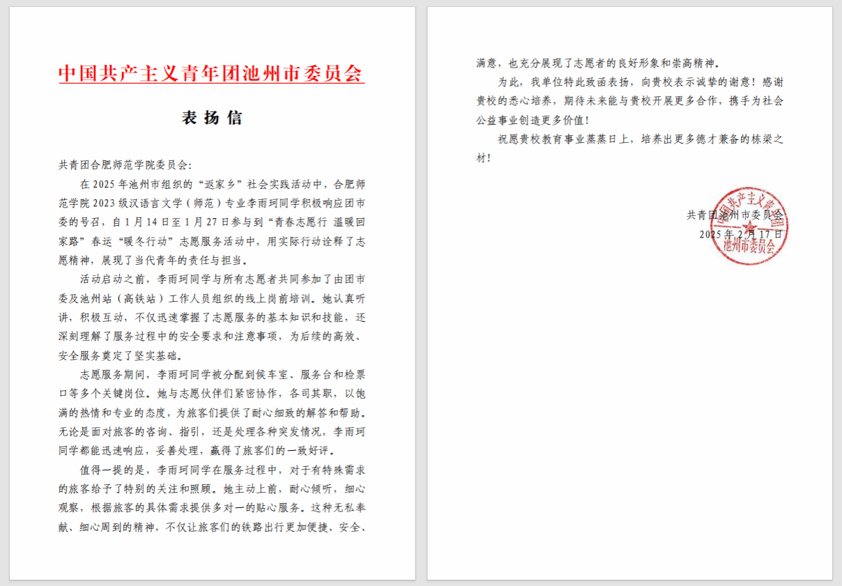李雨珂积极响应池州市团市委的号召,自1月14日至27日参与到“青春志愿行 温暖回家路”春运“暖冬行动”志愿服务活动中,用实际行动诠释了志愿精神。从活动启动之前线上岗前培训中的认真求知、积极互动,牢记安全注意事项,为后续高效服务奠定基础;到志愿服务期间,在候车室、服务台、检票口等多个人员流动大、难度高的岗位,为旅客们提供了耐心细致的解答和帮助。无论是面对旅客的咨询、指引,还是处理各种突发情况,她都能迅速响应,妥善处理,赢得了旅客们的一致好评。活动结束后,中国共产主义青年团池州市委员会向公司发来表扬信。信中表示,李雨珂以饱满的热情和专业的态度,圆满完成了多项任务,充分展现了志愿者的良好形象和崇高精神。
