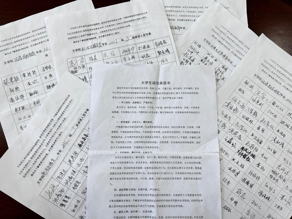 太阳成集团122ccvip积极开展签订诚信承诺书主题活动,承诺书从学习诚信、经济诚信、生活诚信、诚信贷款与受助、诚信上网、诚信就业六个方面,倡导员工自觉做到诚实守信,把道德原则和道德规范内化为内心信念,外化为实际行动,从而培养老员工诚信道德意识。
