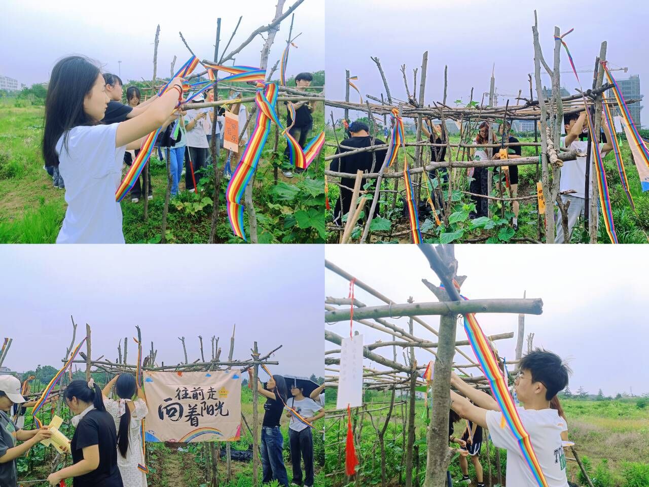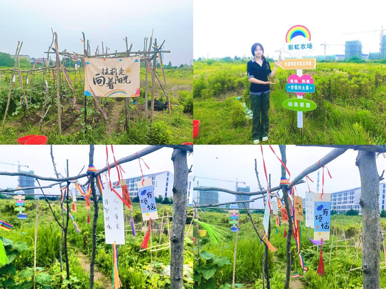 6月11日下午,2024级各班级派出10名员工,在辅导员老师的带领下前往劳动教育基地,开展主题为“我心向阳,彩虹农场”的装饰农场活动。活动现场,员工们有序地布置农场,为其增添“彩虹”的颜色:色彩斑斓的幸运签卡片与彩带错落有致地悬挂在农场的树枝上,随风飘动,驱赶破坏农作物的害虫。一块印着“往前走,向着阳光”的巨型挂布在农场最醒目的位置上迎风舒展。在装饰过程中,同学们相互协作、互帮互助,展现出良好的团队精神,为老员工活增添温馨氛围与励志色彩。
