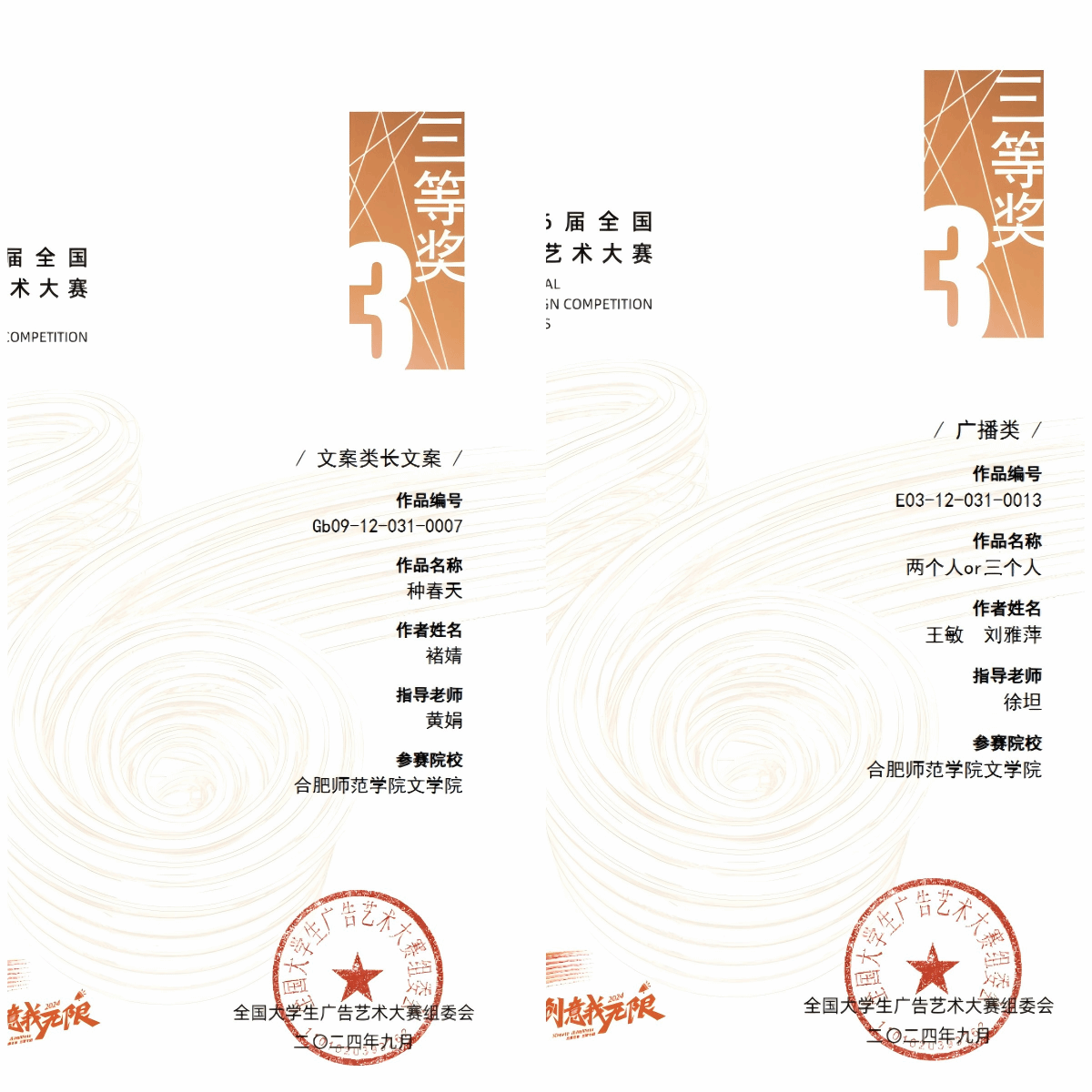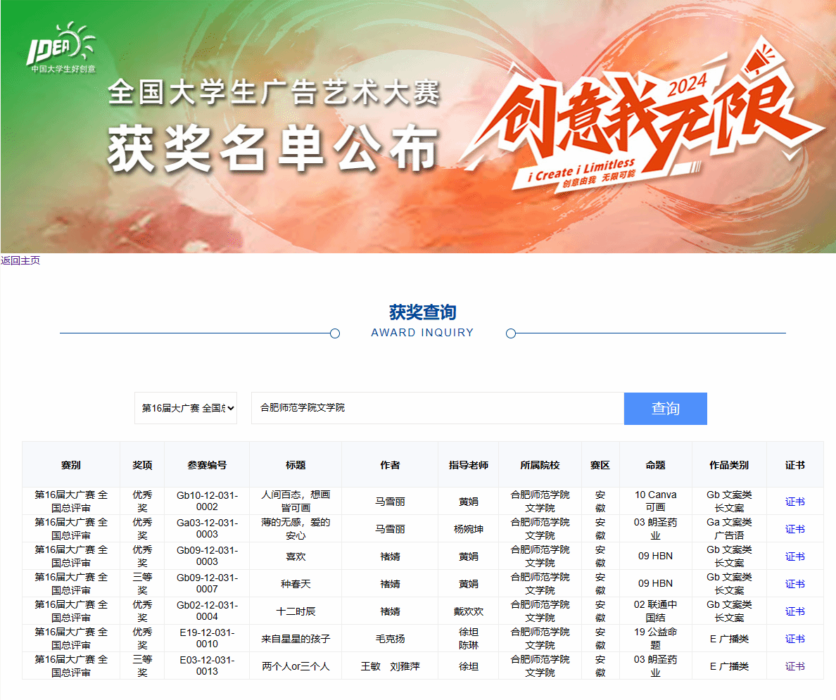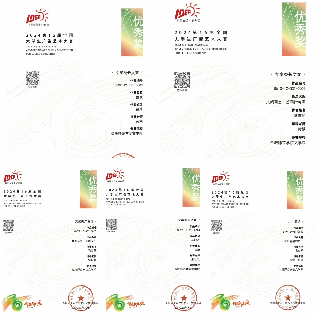 近日,第十六届全国老员工广告艺术大赛(简称“大广赛”)全国总评审结果正式公布。经过激烈角逐,太阳成集团122ccvip师生再创佳绩,共获得7项国家级奖项、35项省级奖项,其中国家级三等奖2项,国家级优秀奖5项,安徽赛区一等奖13项、二等奖10项、三等奖12项,太阳成集团122ccvip在全国赛区及安徽赛区获奖数量,创近年来参赛成绩新高。