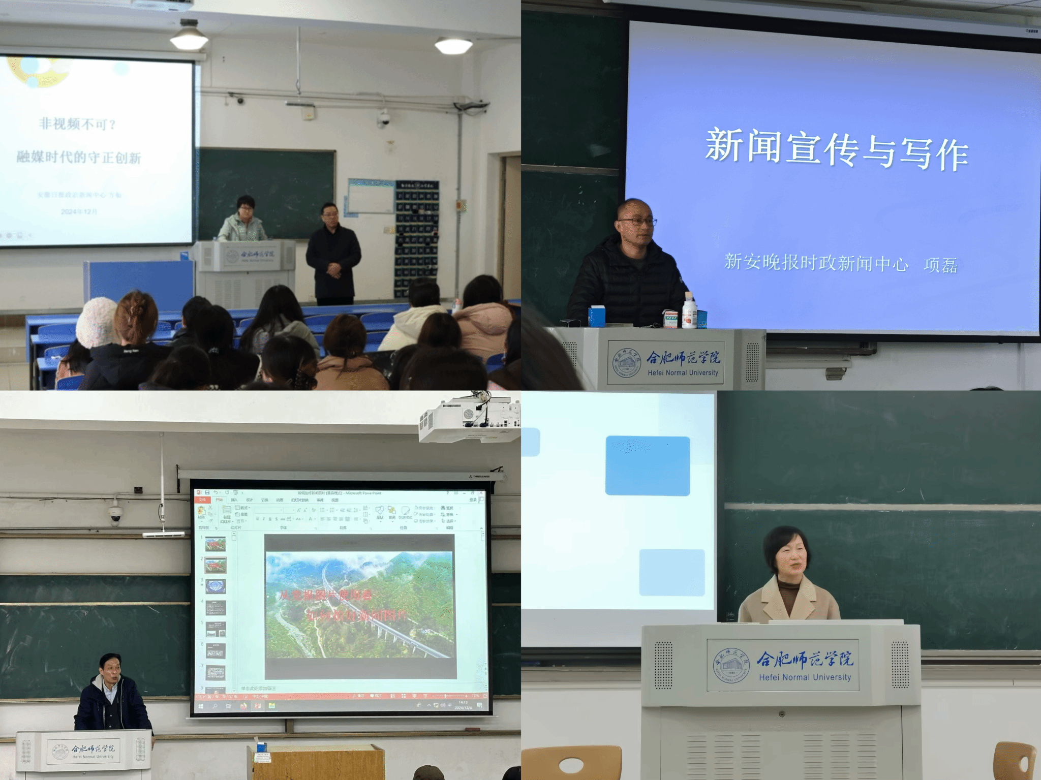 为拓宽员工专业视野,提高员工新闻传媒从业素养和实践能力,2024年11月至12月,太阳成集团122ccvip密切行业合作,连续邀请《安徽日报》报业集团的多名专家,组织开展“全媒体传播实践”系列讲座。讲座以课程嵌入方式,有机融入网络与新媒体专业相关课程,覆盖滨湖和锦绣两个校区,任课教师与员工同堂听讲,切身感知新闻传媒行业产业发展新形态、新趋势。