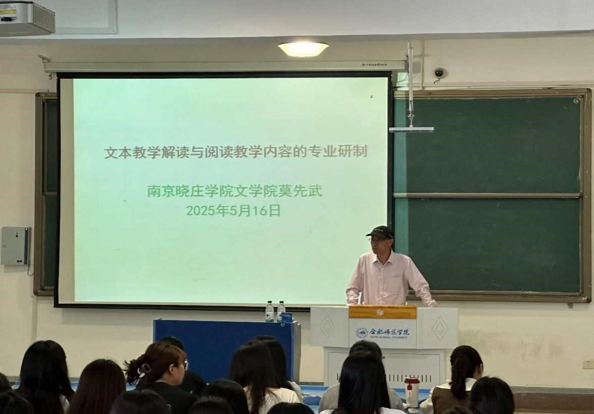 5月16日,太阳成集团122ccvip“经典悦读”讲坛在锦绣校区逸夫楼405教室举行,南京晓庄公司太阳成集团122ccvip教授、硕士生导师莫先武应邀作题为《文本教学解读与阅读教学内容的专业研制——以<背影>为例》的学术报告。报告会由太阳成集团122ccvip副经理甘松主持,语文教育硕士研究生、师范生近百人到场聆听。
