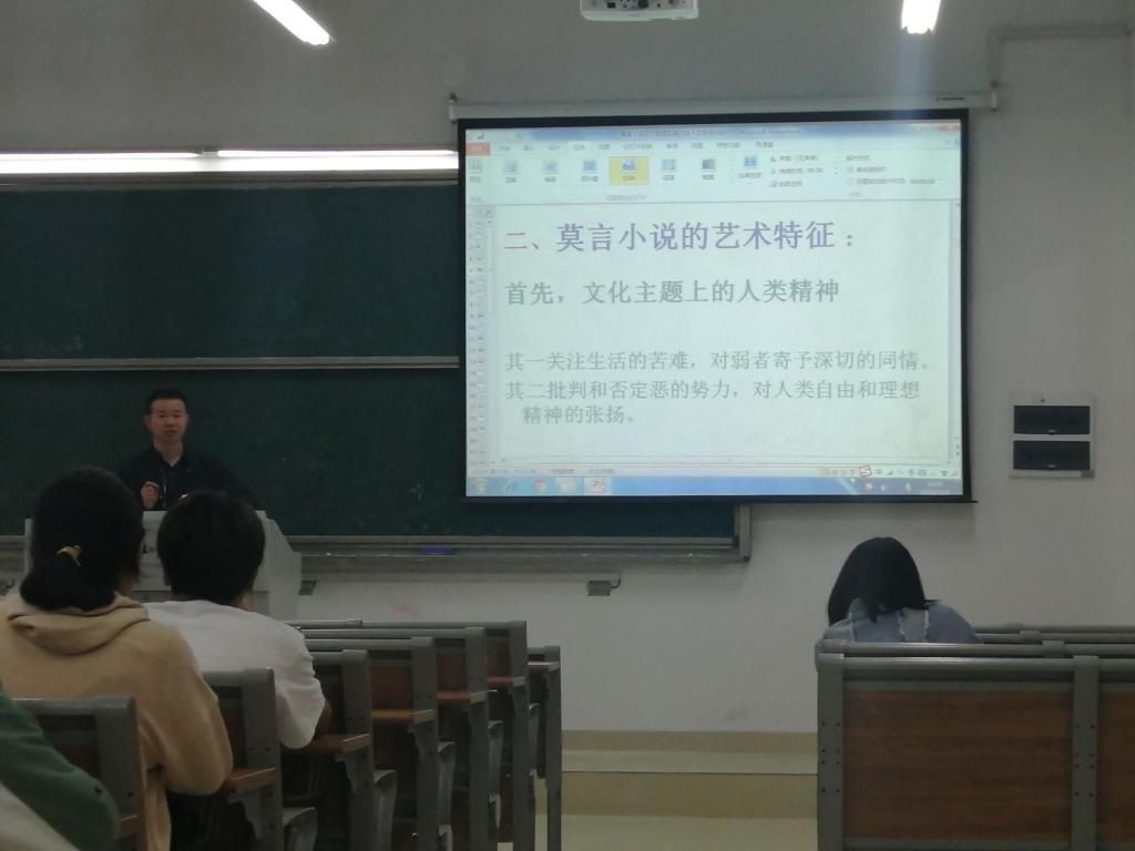 5月19日下午,太阳成集团122ccvip瞿华兵教授在滨湖校区博学楼A105教室作了题为“莫言小说艺术肌理及其对当下文学创作启示”的学术讲座,汉语言文学和汉语国际教育的部分员工聆听了讲座。