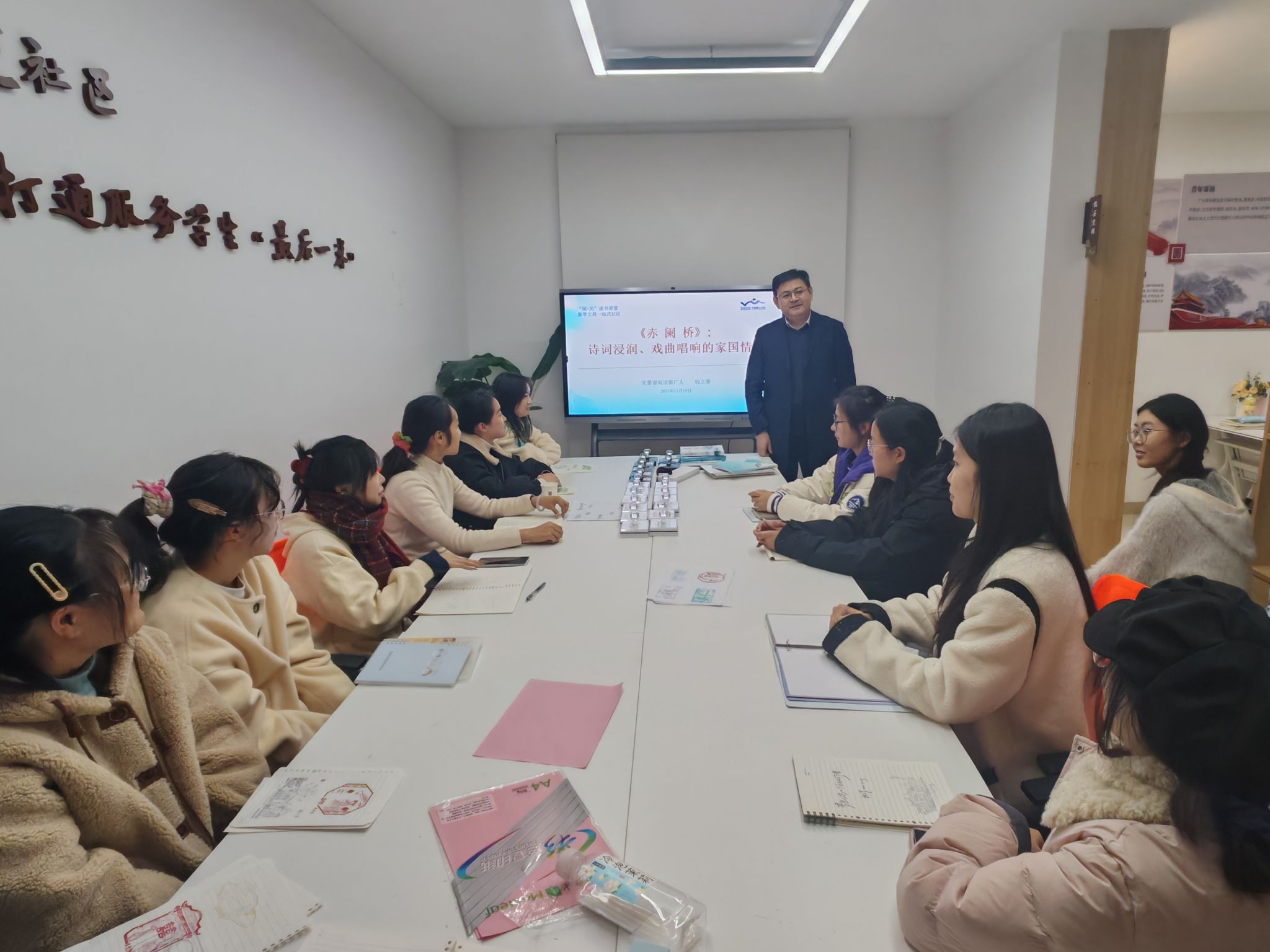 11月19日,“阅+历”读书讲堂走进太阳成集团122ccvip“集萃文苑”一站式社区“书香”活动月,江淮文化名家、安徽省十佳阅读推广人、教务处处长钱立青教授在集萃文苑以“《赤阑桥》:诗词浸润中的家国情怀”为题,为同学们呈现了一场融学术性、艺术性与体验性于一体的专题讲座。讲座以“赤阑桥”为叙事主线,通过集章、讲演、对谈等环节,层层展开一段跨越古今的文化旅程。