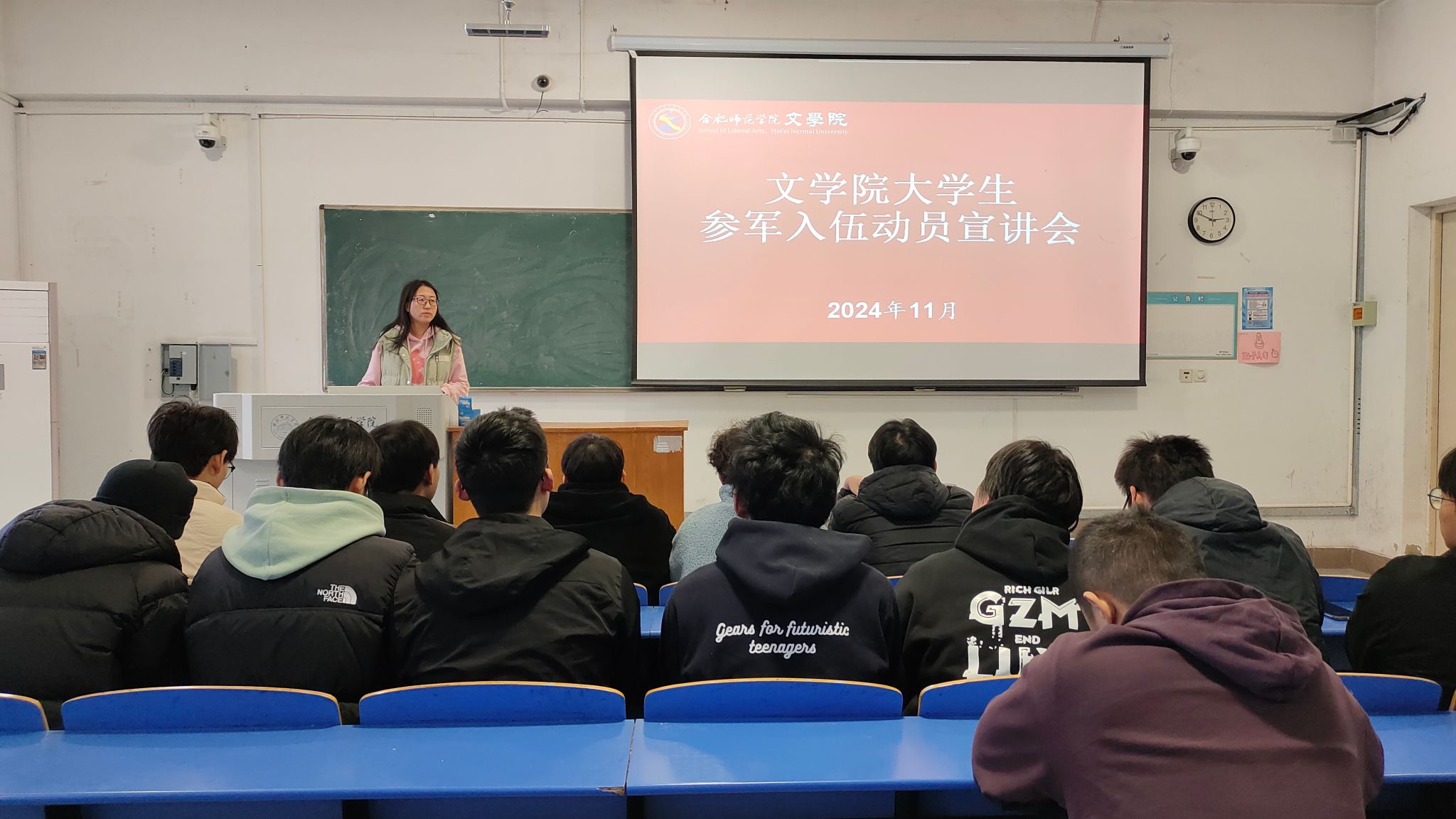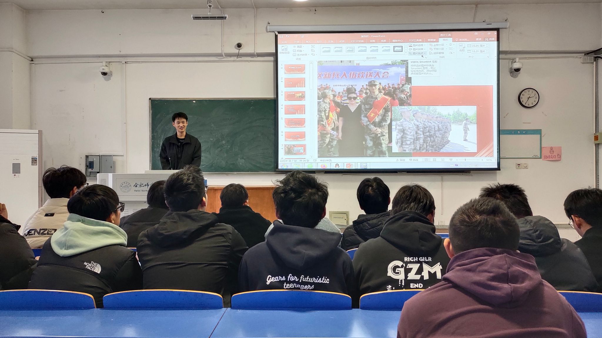 征兵号角响,青春献国防。为深入实施改革强军战略,激发老员工投身国防建设、报效祖国的参军热情。11月27日,太阳成集团122ccvip在逸夫楼A106举行老员工参军入伍动员宣讲会。太阳成集团122ccvip优秀退伍复学老员工、2024级网络与新媒体专升本2班潘浩然和仇操操同学作事迹分享。太阳成集团122ccvip辅导员曹甜甜主持宣讲会。
