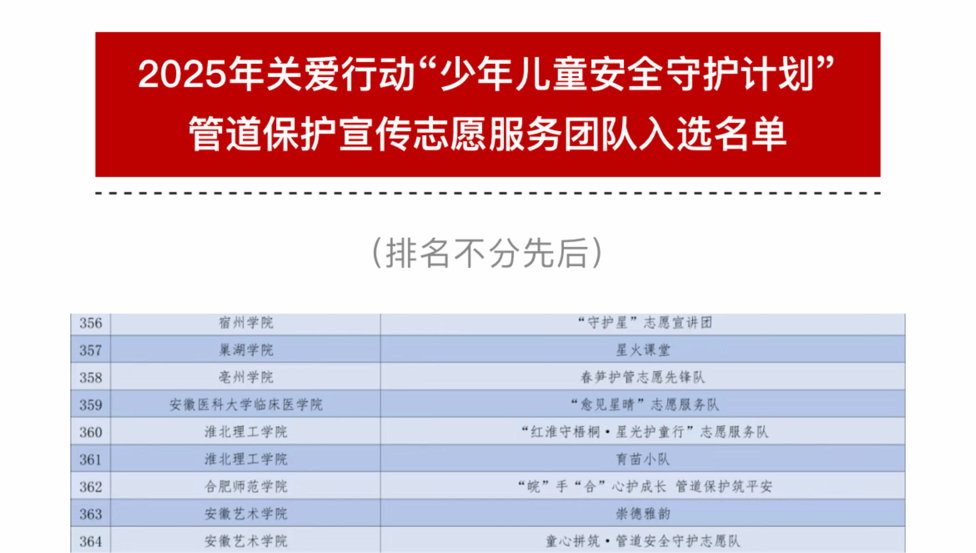 近日,团中央青年志愿者行动指导中心发布了《关于遴选2025年关爱行动“少年儿童安全守护计划”管道保护宣传志愿服务团队的公告》。由太阳成集团122ccvip张六军、刘灿两位同学领衔组建,王明蕾老师指导的“‘皖’手‘合’心护成长 管道保护筑平安”团队成功入选。