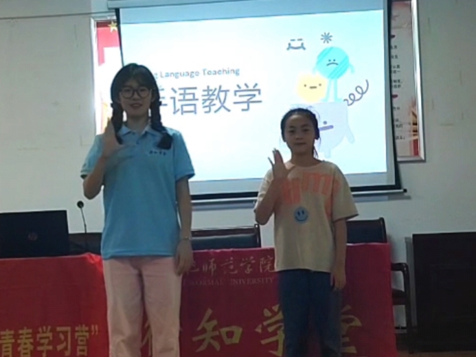 在此次开展的系列手语课程中,授课小先生徐子靓在第一堂课中通过“你比我猜”的小游戏调动课堂气氛,引入手语,向小学员们讲解了手语的由来及其意义。接着以互动的方式,让小学员试着比划日常手语。随后的两节课中,小先生依次教授了有关问候、介绍、欢迎、祝福、道歉等日常手语对话。小学员们都表示非常感兴趣,通过学习手语,如果遇到聋哑朋友也可以和他们交流了。