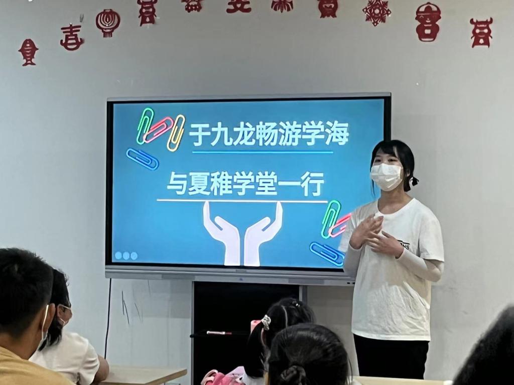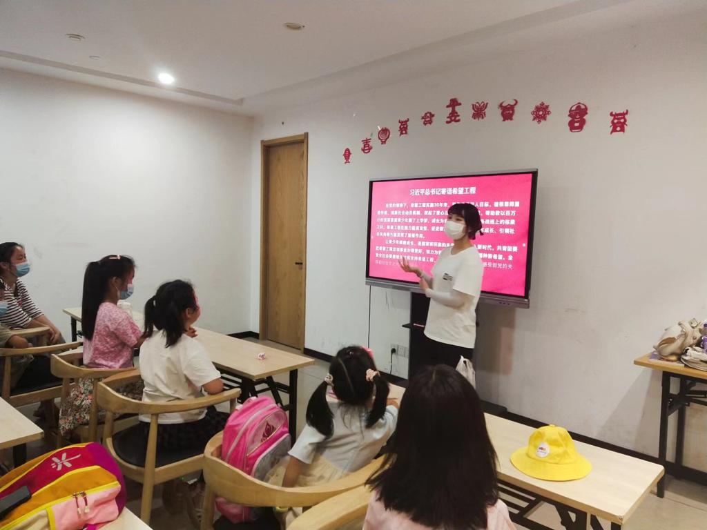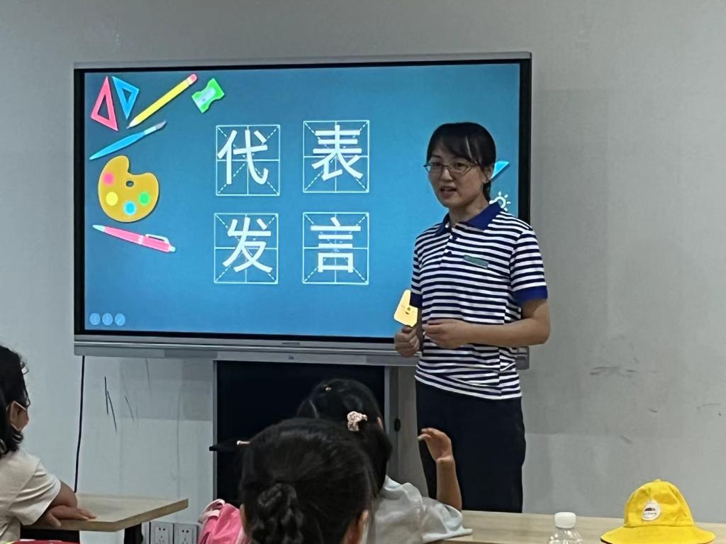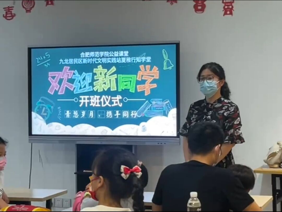 此次开班仪式是由夏稚行知学堂的领队小先生——陈睿主持的。首先,她向全体同学和家长介绍了公司行知学堂的办学理念、办学背景以及学堂的概貌。行知学堂自开办以来,一直深受广老员工的喜爱,在安徽多地以公益课堂为形式开展,引导青年员工实践出真知、实践长真才,也曾多次被《中国青年报》《人民日报》等报刊或网页刊登宣传。本次夏稚行知学堂以“思想教育”“兴趣培养”“科学普及”“情感教育”“心理辅导”“劳动教育”“公益实践”“安全防护”“课业辅导”为主要内容,开展了十五项课程,并安排专门的小先生进行教学教导。